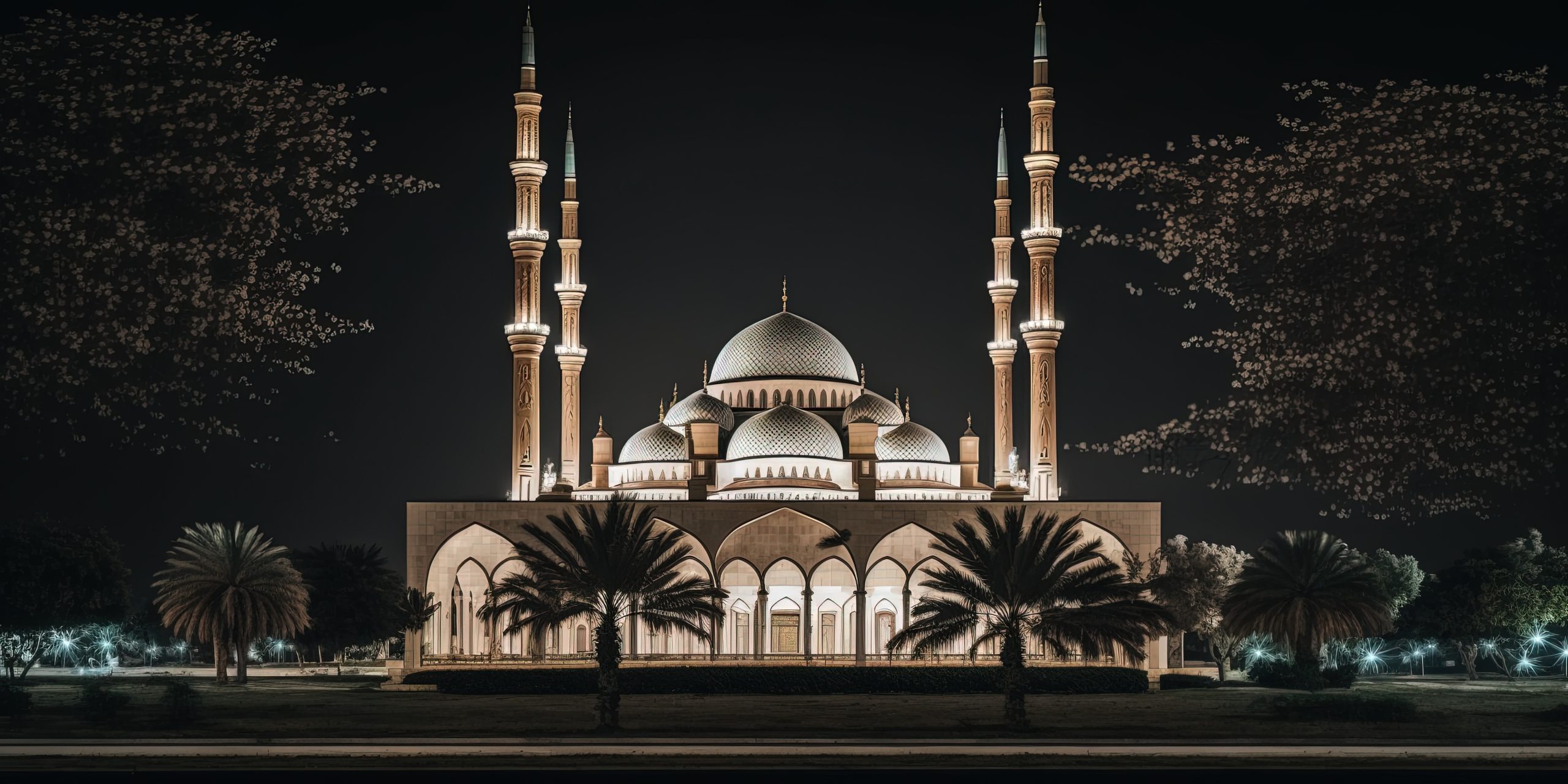 The beautiful serene Mosque at night in the blessed month of Ramadan, the illuminated . Generative AI.