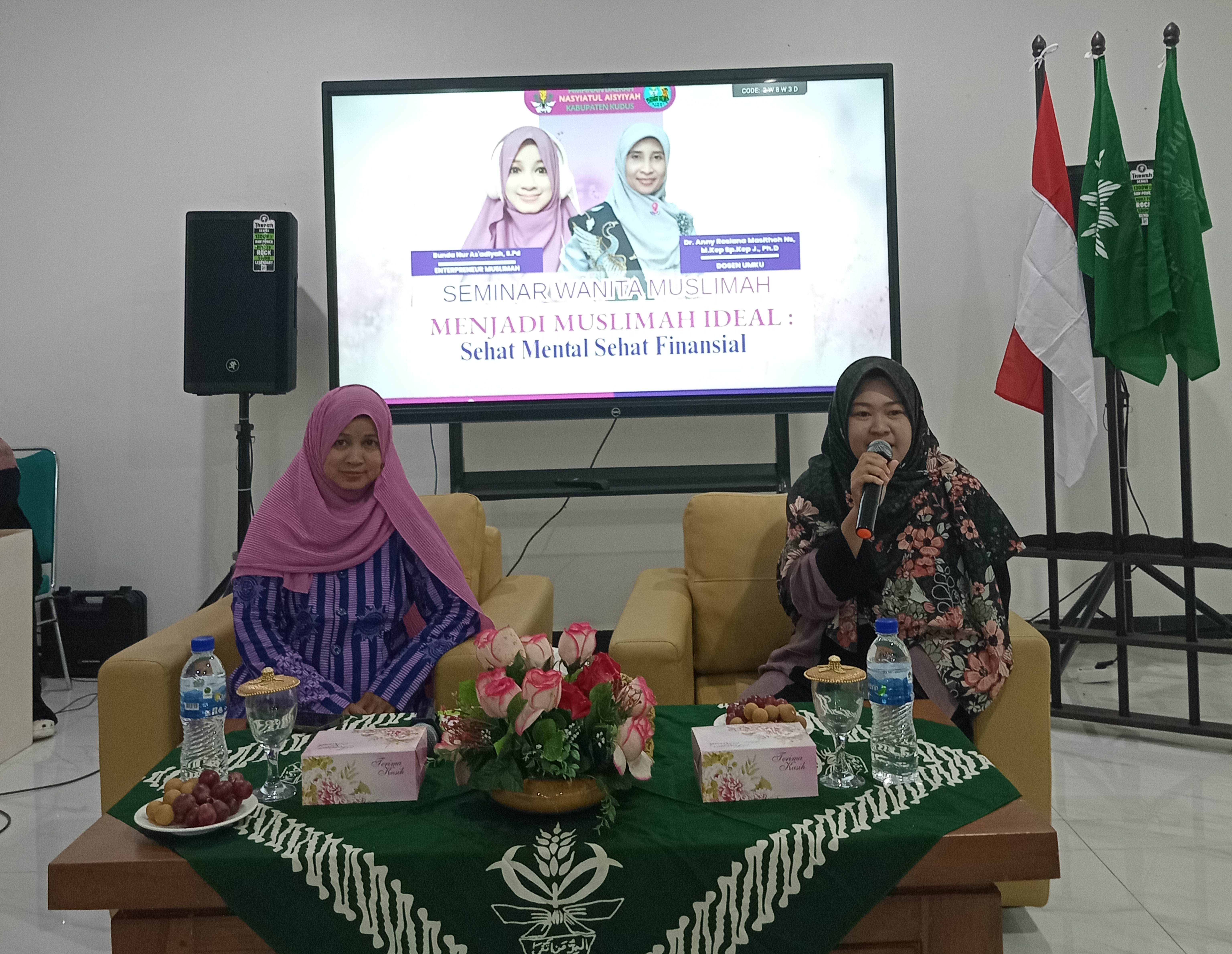 Narasumber pertama, Dr. Anny Rosiana Masithoh, Ns., M.Kep.J., Ph.D., dosen Universitas Muhammadiyah Kudus, menyampaikan materi bertajuk “Kepribadian Muslimah: Membangun Mental dan Soft Skill Wanita Muslimah”. Ia menjelaskan bahwa perempuan dengan kesehatan mental yang baik mampu mengelola emosi, menghadapi tekanan hidup, bersikap realistis terhadap kemampuan diri, membangun relasi yang sehat, serta menjalani pola hidup seimbang. Selain itu, perempuan yang sehat mental akan lebih percaya diri, produktif, mandiri secara emosional, dan berani mencoba hal-hal baru.Lebih lanjut, Dr. Anny menegaskan bahwa kesehatan mental memiliki keterkaitan erat dengan kesehatan finansial. Perempuan yang stabil secara mental akan lebih siap mengelola keuangan, memiliki tabungan, investasi, serta sumber penghasilan yang tidak sepenuhnya bergantung pada orang lain.