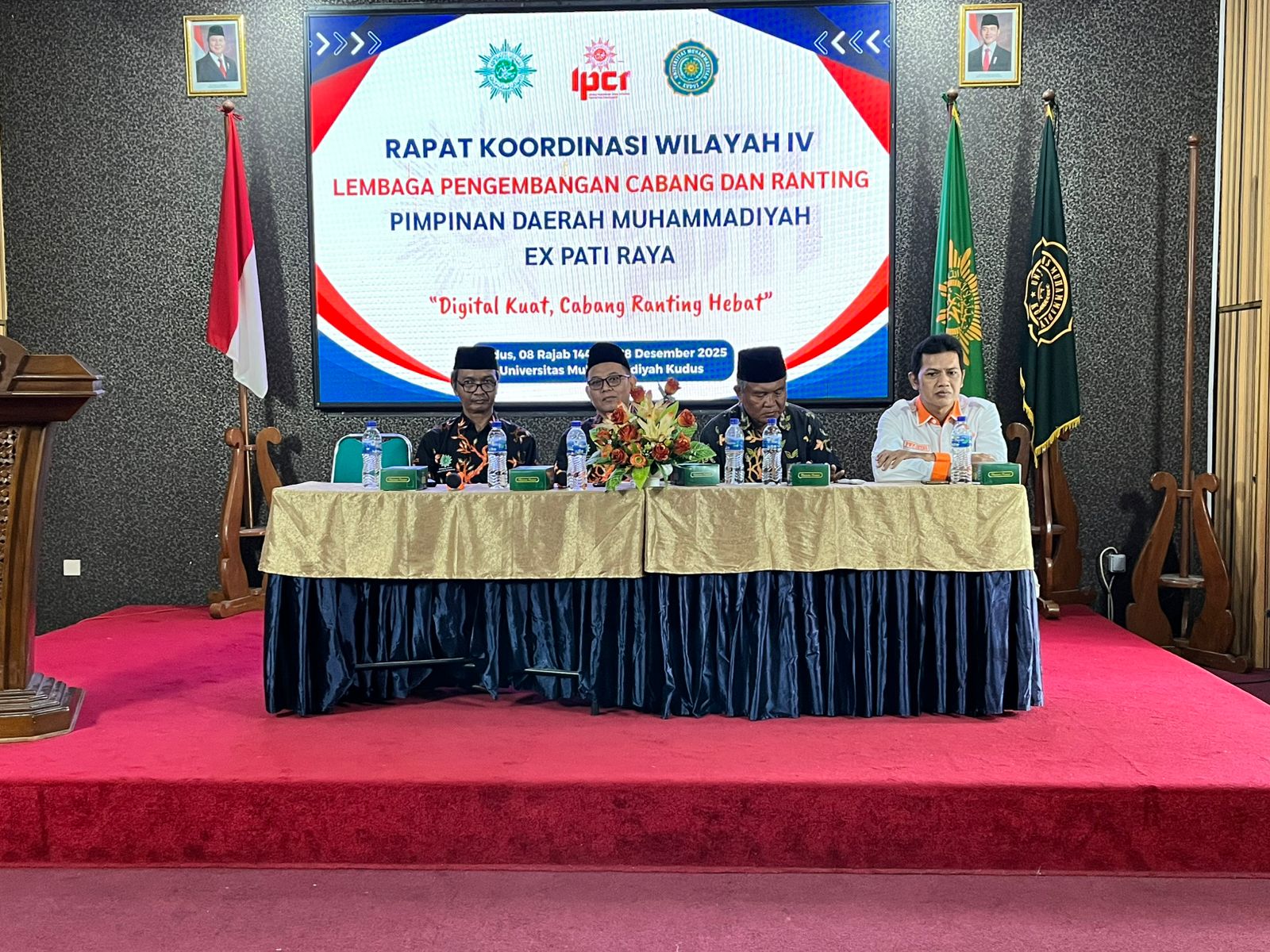 Kudus, Ahad (28/12/2025) — Lembaga Pengembangan Cabang dan Ranting (LPCR) Pimpinan Daerah Muhammadiyah (PDM) se-Karesidenan Pati Raya menggelar Rapat Koordinasi Wilayah (Rakorwil) IV di Universitas Muhammadiyah Kudus (UMKU). Kegiatan ini mengusung tema “Digital Kuat, Cabang Ranting Hebat” sebagai upaya memperkuat eksistensi dan pengelolaan organisasi Muhammadiyah di era digital.